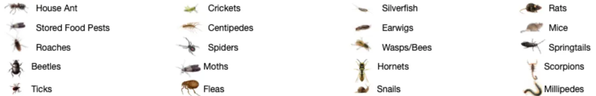 Designed to prevent any of the pests listed below from becoming a problem. We service your neighborhood year-round so no pre-selected appointment is required for exterior service. Unless otherwise requested we will automatically schedule your home for service best fit to neighboring customers within the scheduling guidelines listed below.